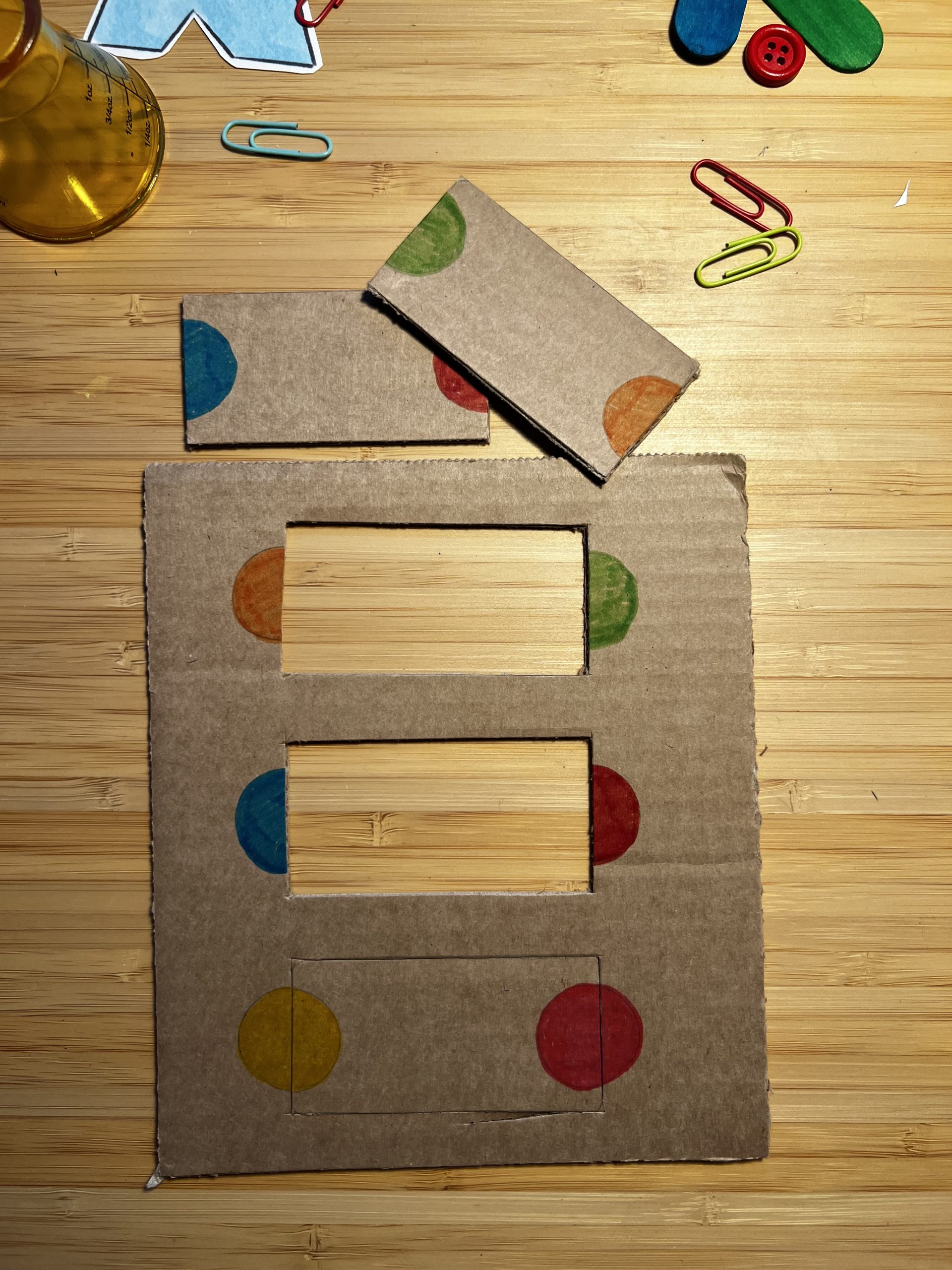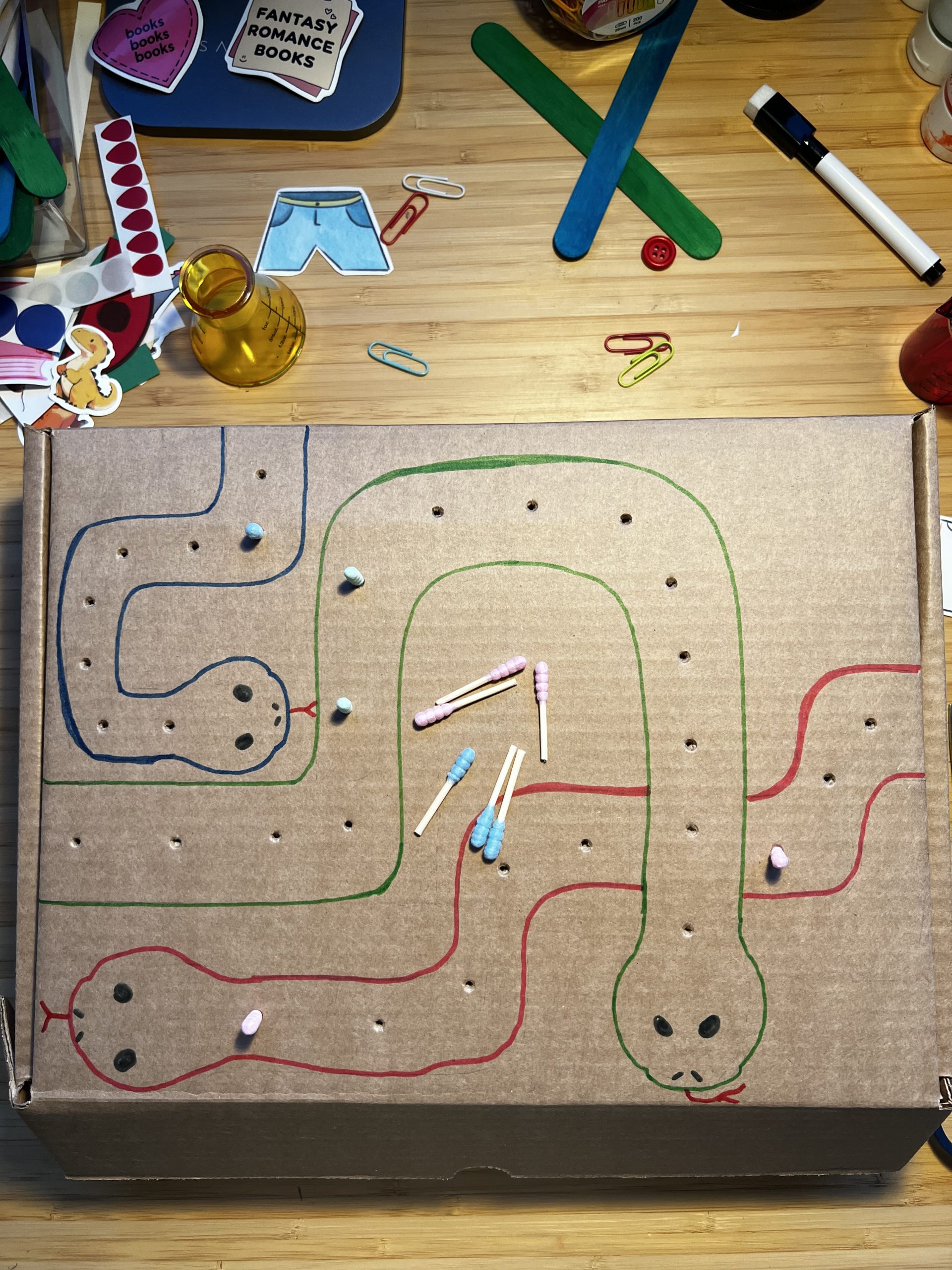 🐍 Șerpișori colorați pe cutia mare – introdu bețe de urechi și completează jocul.